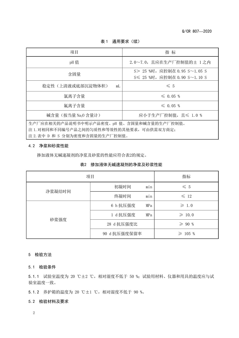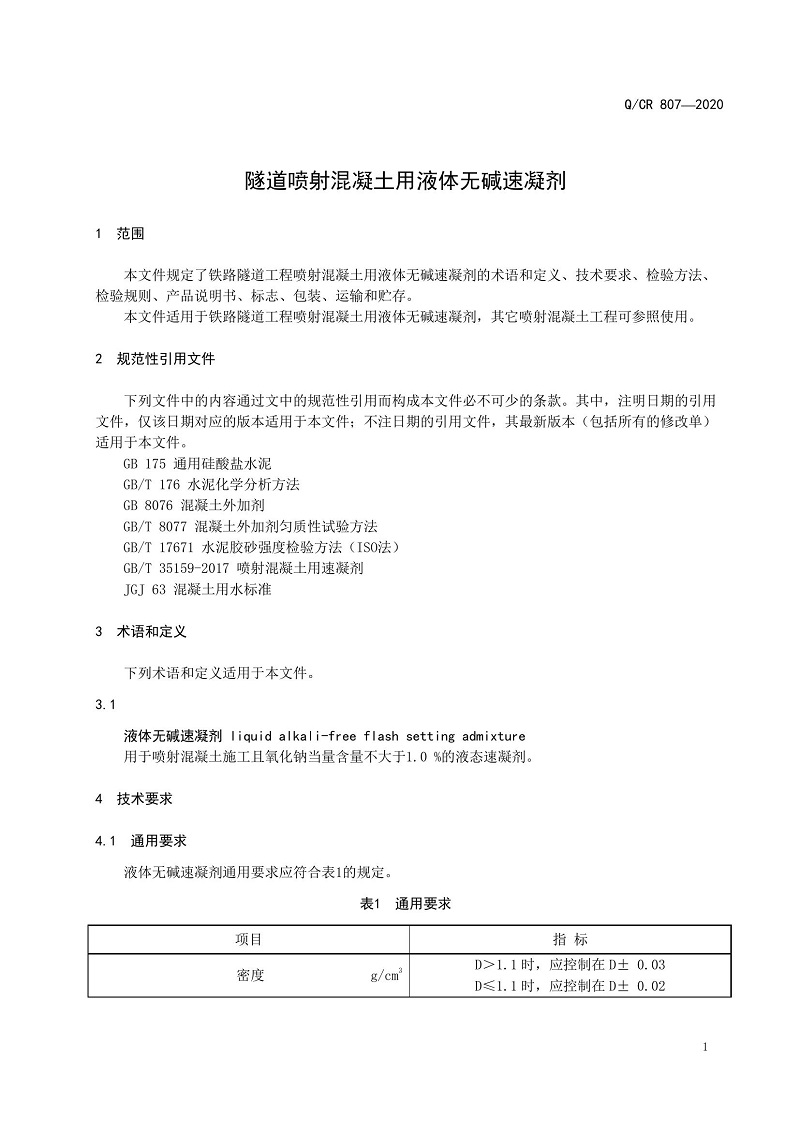 QCR 807-2020國鐵集團(tuán)技術(shù)標(biāo)準(zhǔn)《隧道噴射混凝土用液體無堿速凝劑》